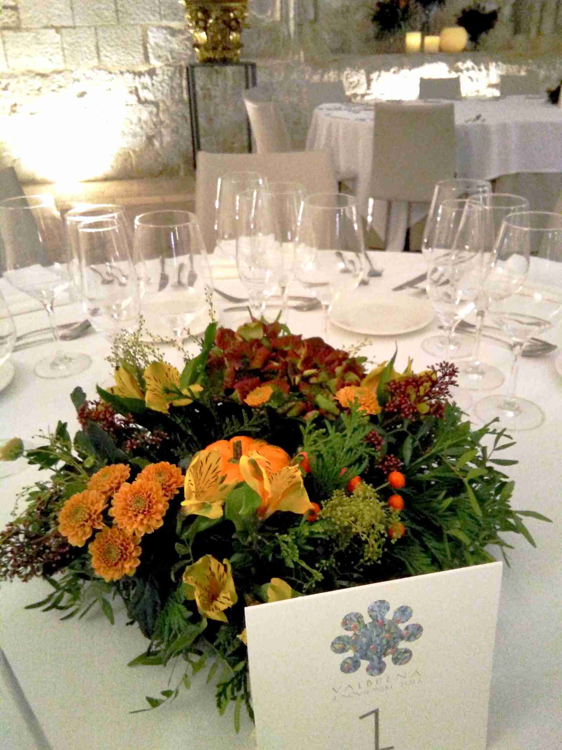 La decoración floral consistió en centros de mesa con hortensia de otoño, calabazas, alstromerias amarillas, skimia, santinis y verdes variados…