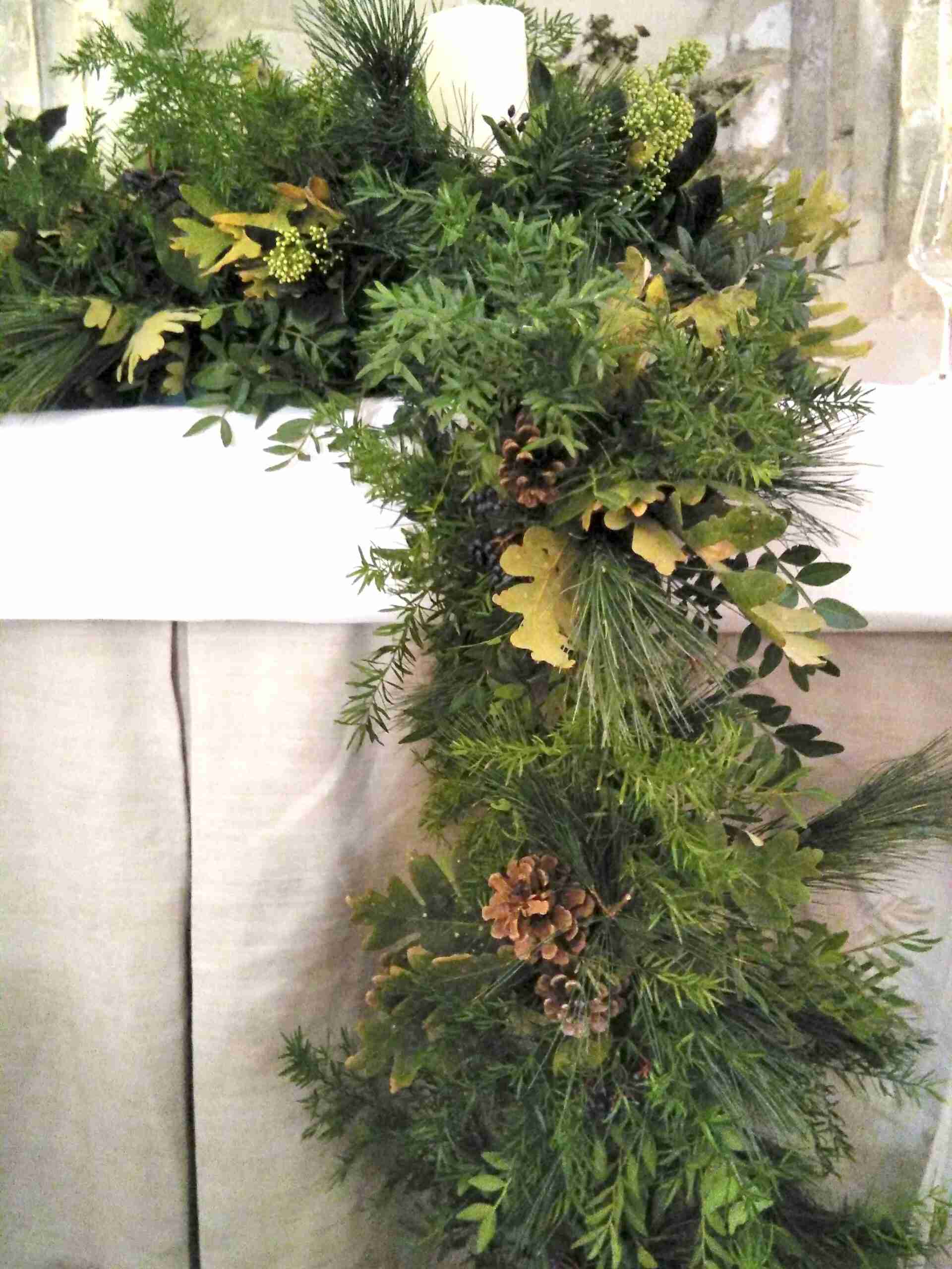 Optamos por realizar La guirnalda en los mismos elementos que los centros de mesa de los invitados. Piñas, hojas de roble… pero con el protagonismo que merecia, por su gran espesor y tamaño.