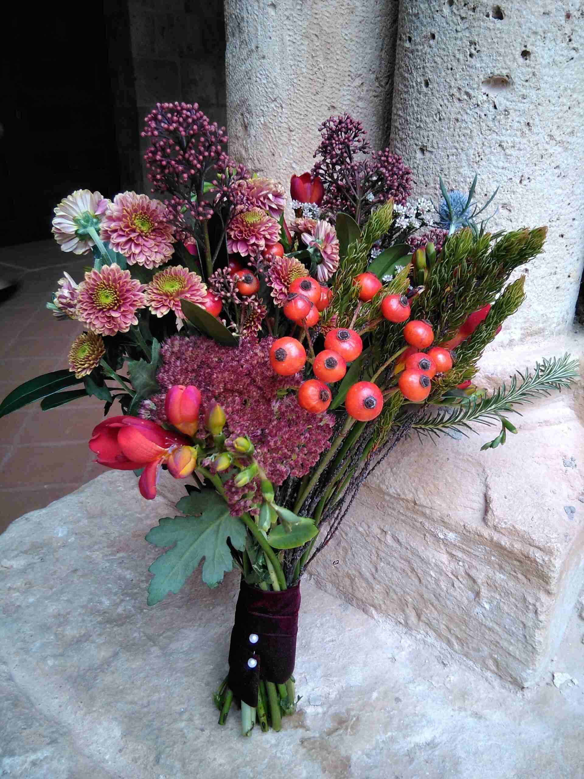 El ramo de la novia también en unos colores y flores muy otoñales. las flores utilizadas son, santini, escaramujo, eryngium, skinia y fresias.