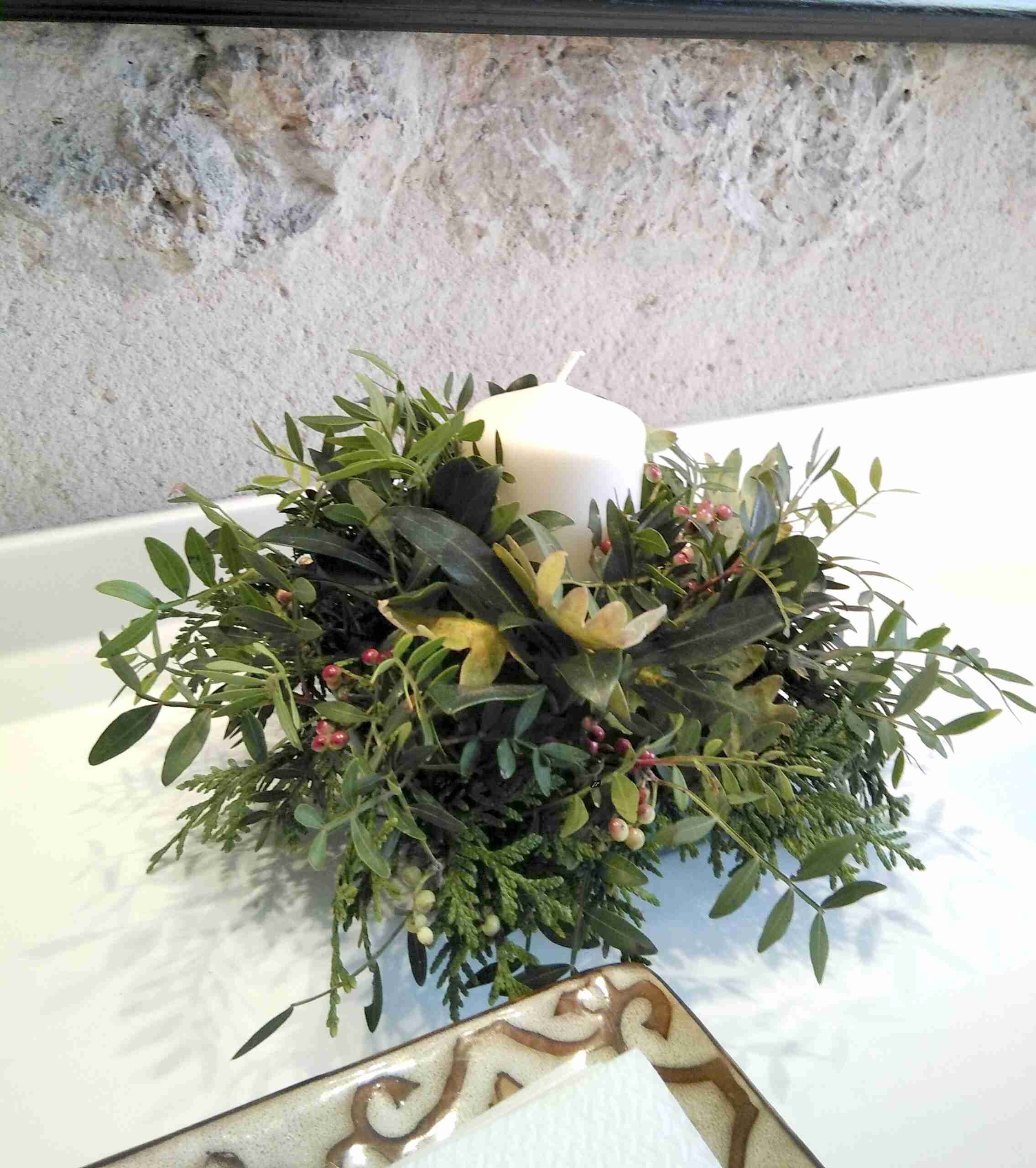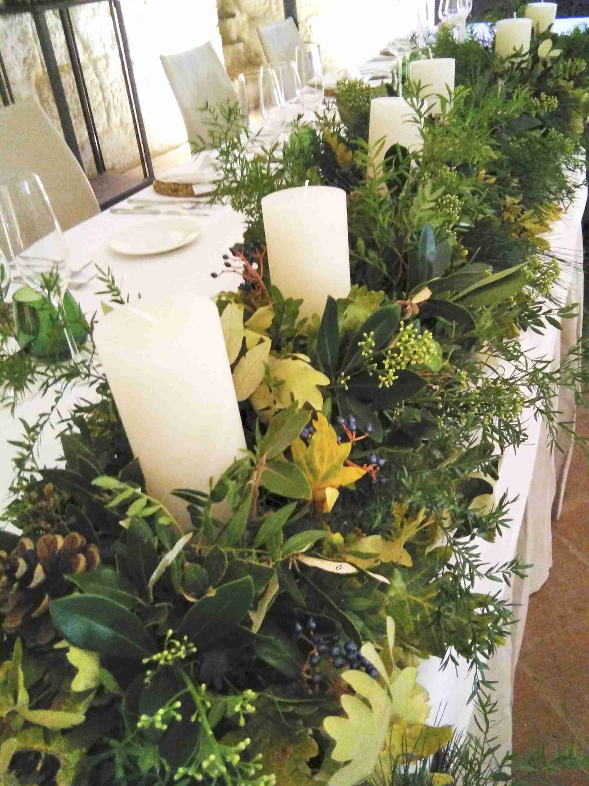 Optamos por realizar La guirnalda en los mismos elementos que los centros de mesa de los invitados. Piñas, hojas de roble… pero con el protagonismo que merecia, por su gran espesor y tamaño.