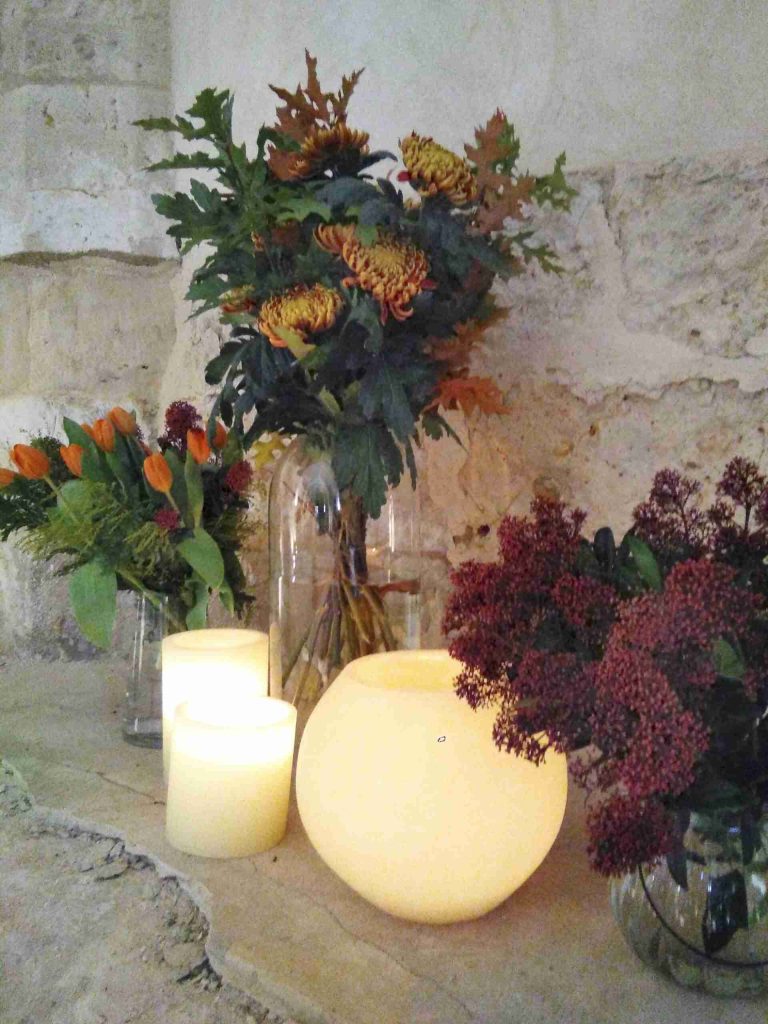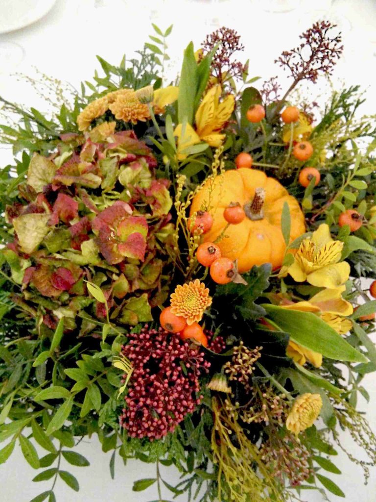 La decoración floral consistió en centros de mesa con hortensia de otoño, calabazas, alstromerias amarillas, skimia, santinis y verdes variados…