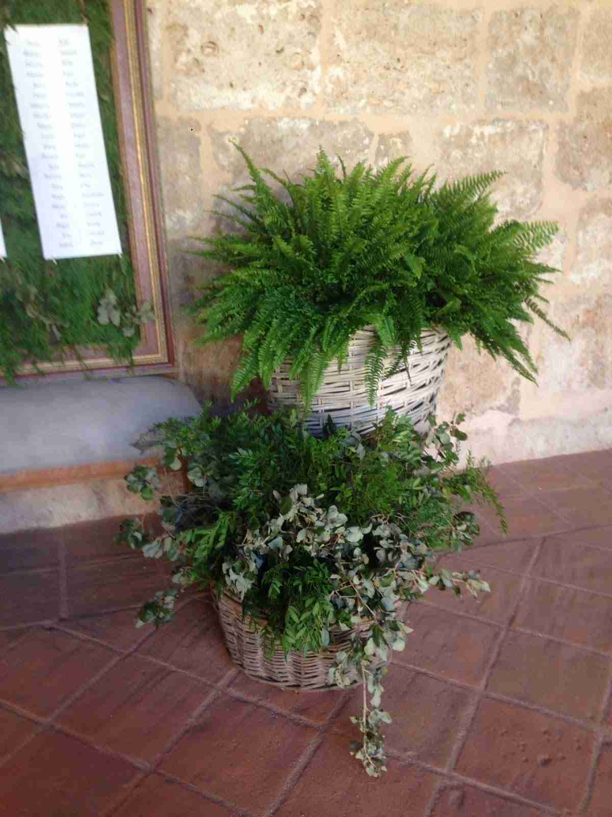 Cestas de helechos y arreglos con hoja de roble en cada rincón. Esta boda sorprendía en cada rincón con detalles, pues no hay nada como utilizar elementos de cercanía para disponer de abundante materia prima y así poder ser más sostenibles.