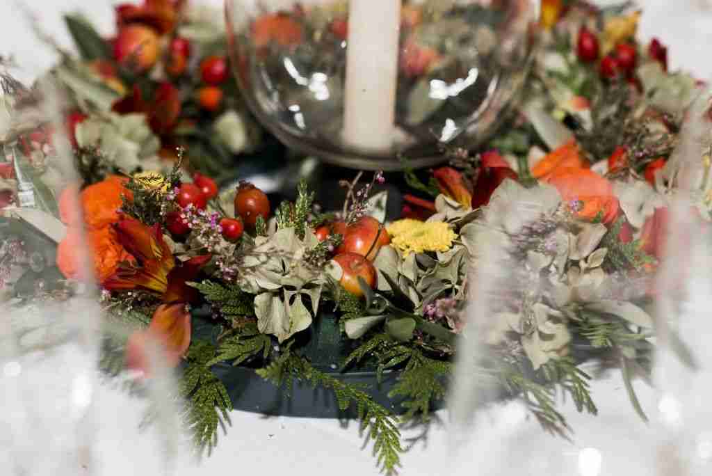 El hotel Monasterio de Valbuena lo decoramos con colores naranjas y verdes de otoño. El coctel con rositas ramificadas y las mesas con coronitas de flores con un fotóforo.