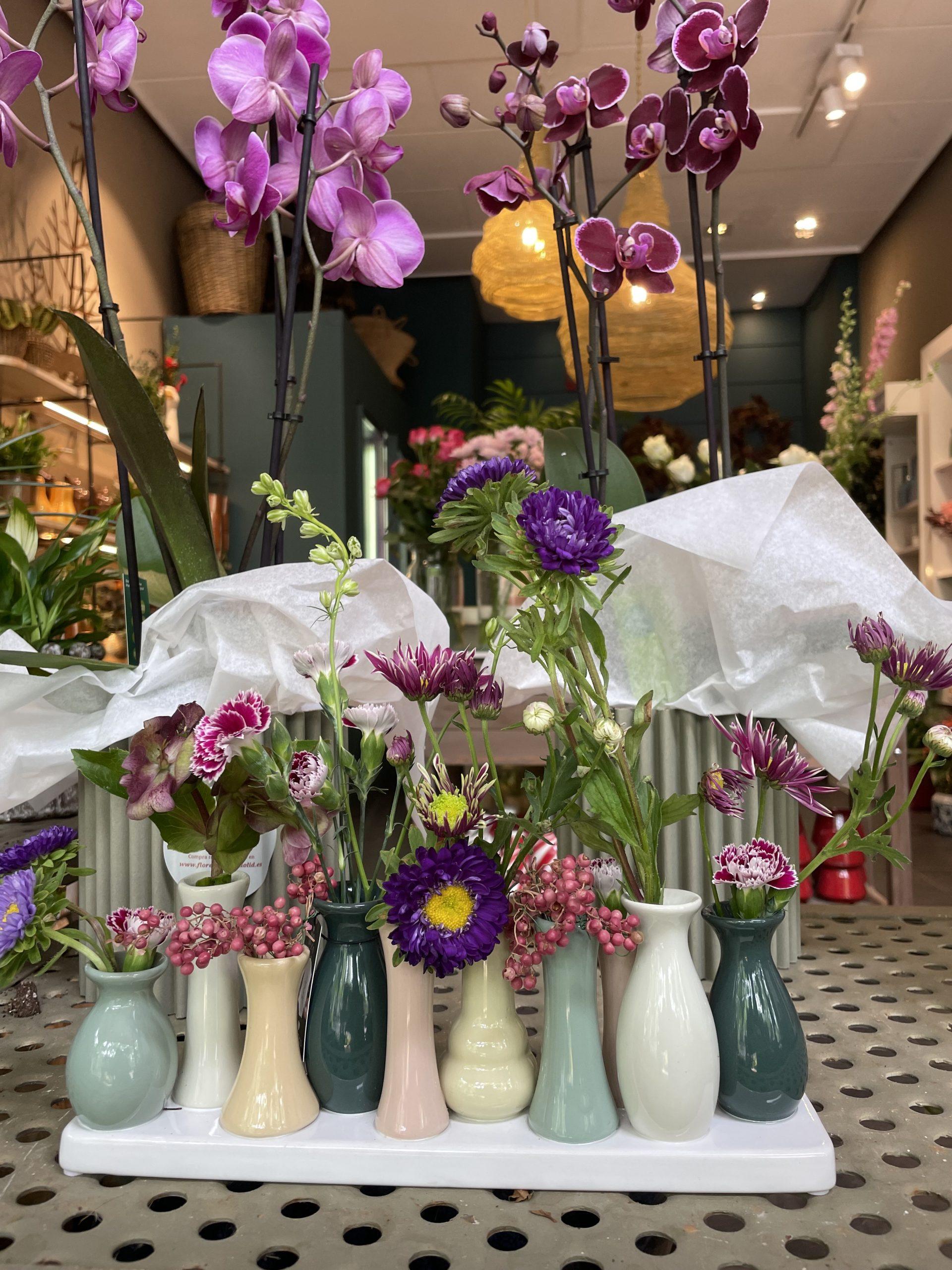 Bandeja con  jarrones de cerámica para poner flores. Es una pieza