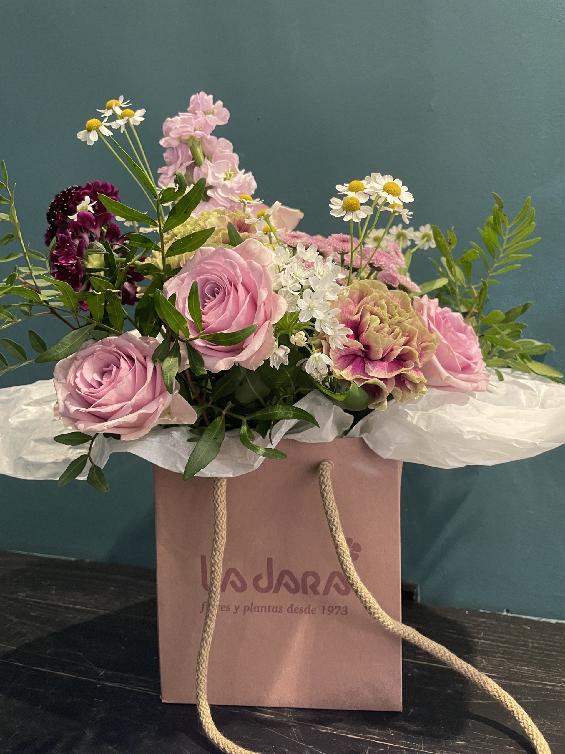 Bouquet con flores de temporada con una original presentación en cestita de cartón