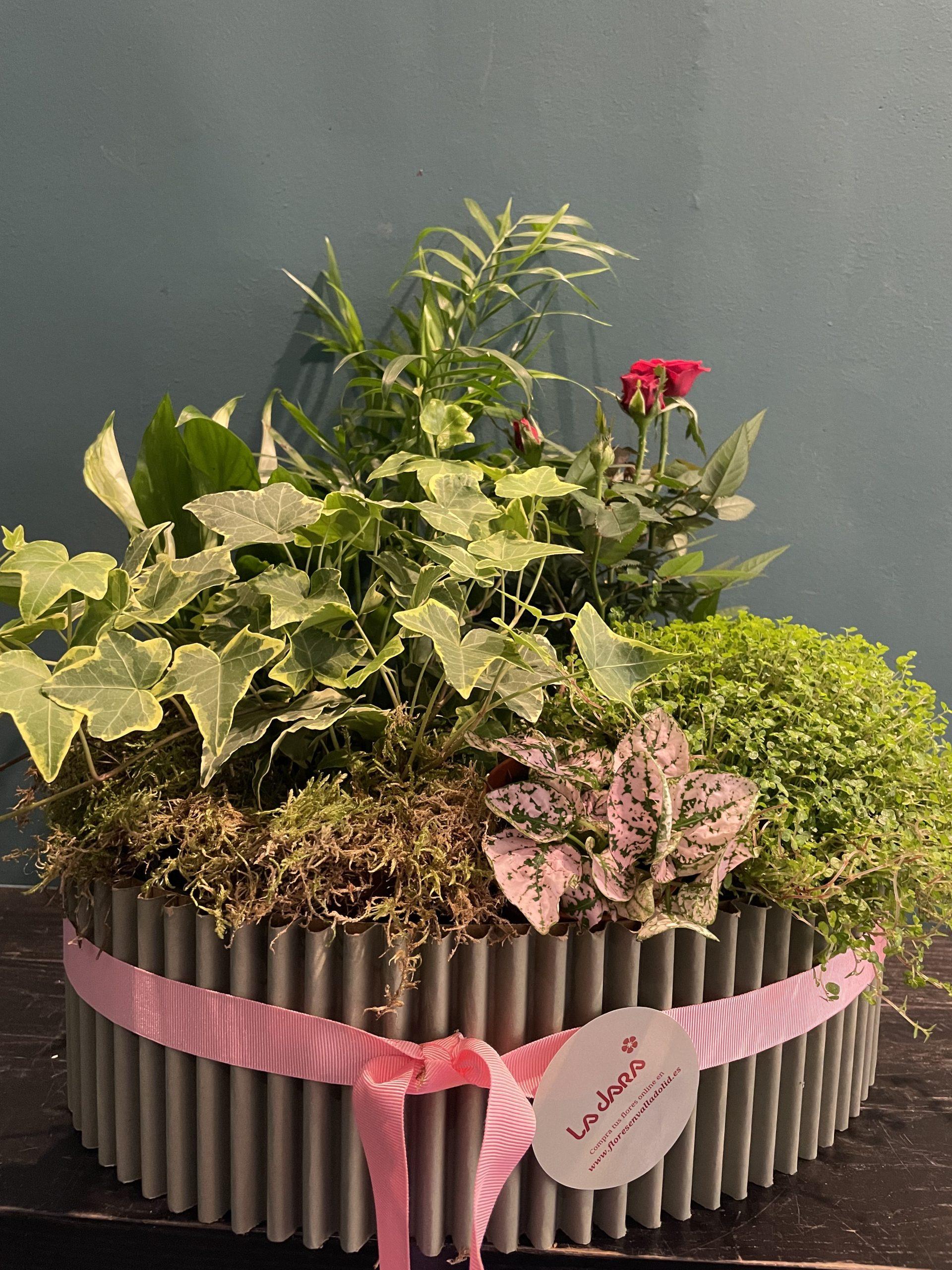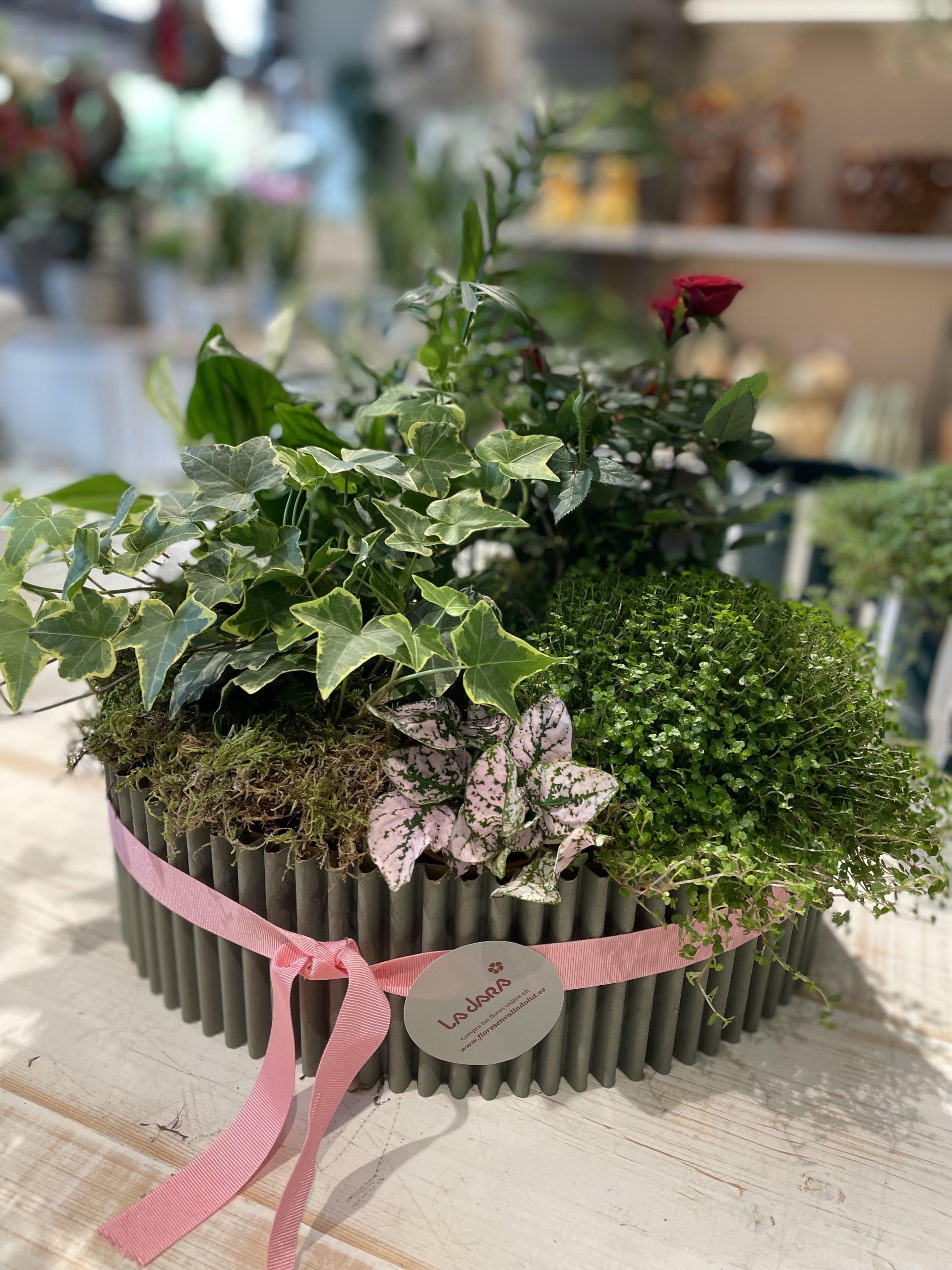 Centro de plantas Elegimos plantas faciles de cuidar dentro de casa. Es importante sacarlas del recipiente en el que vienen presentadas para regar una vez por semana aproximandamente. Este producto es ideal para regalar en ocasiones especiales como cumpleaños, aniversarios, Día de la Madre o San Valentín. Desde Floristería La Jara en Valladolid, te lo preparamos con mimo y te lo enviamos a domicilio. Perfecto para llenar de color y emoción cualquier momento. Compra online y sorprende con flores frescas y originales.