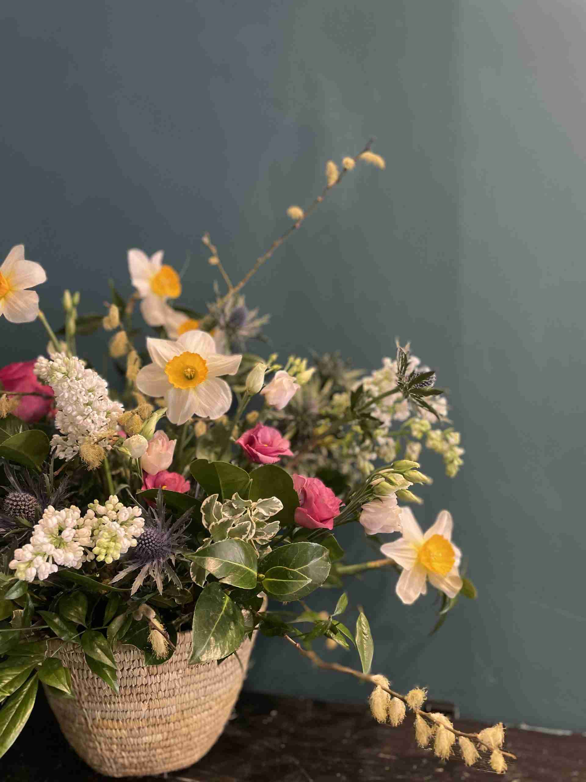 Cesto de fibra natural con flores de temporada.