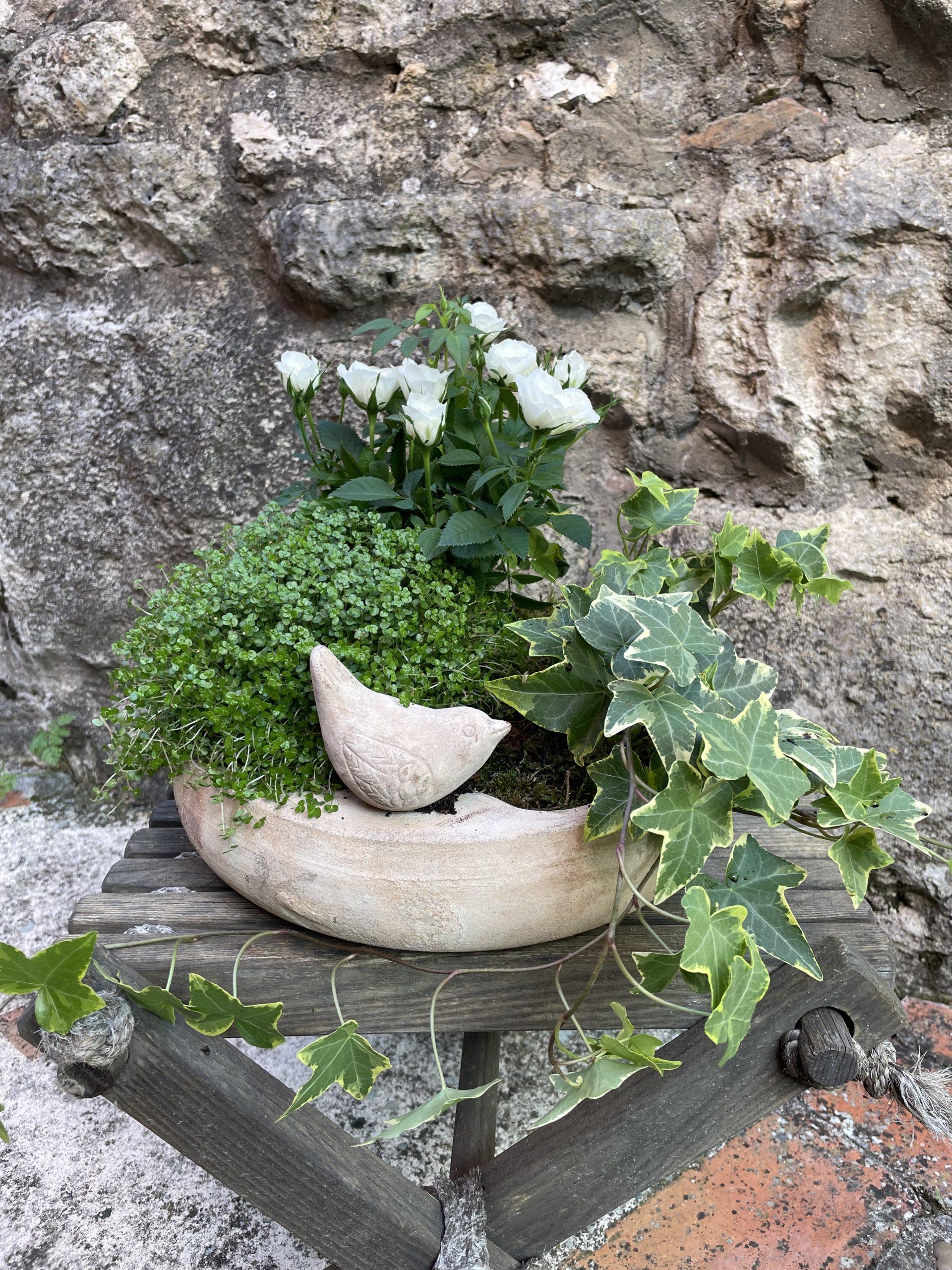 Centro de plantas de exterior. Para decorar tu mesa de jardín. Consta de tres plantas de sombra por lo que es ideal para un porche o una mesa en el jardín a la sombra. Necesita poco riego porque mantiene bastante la humedad.