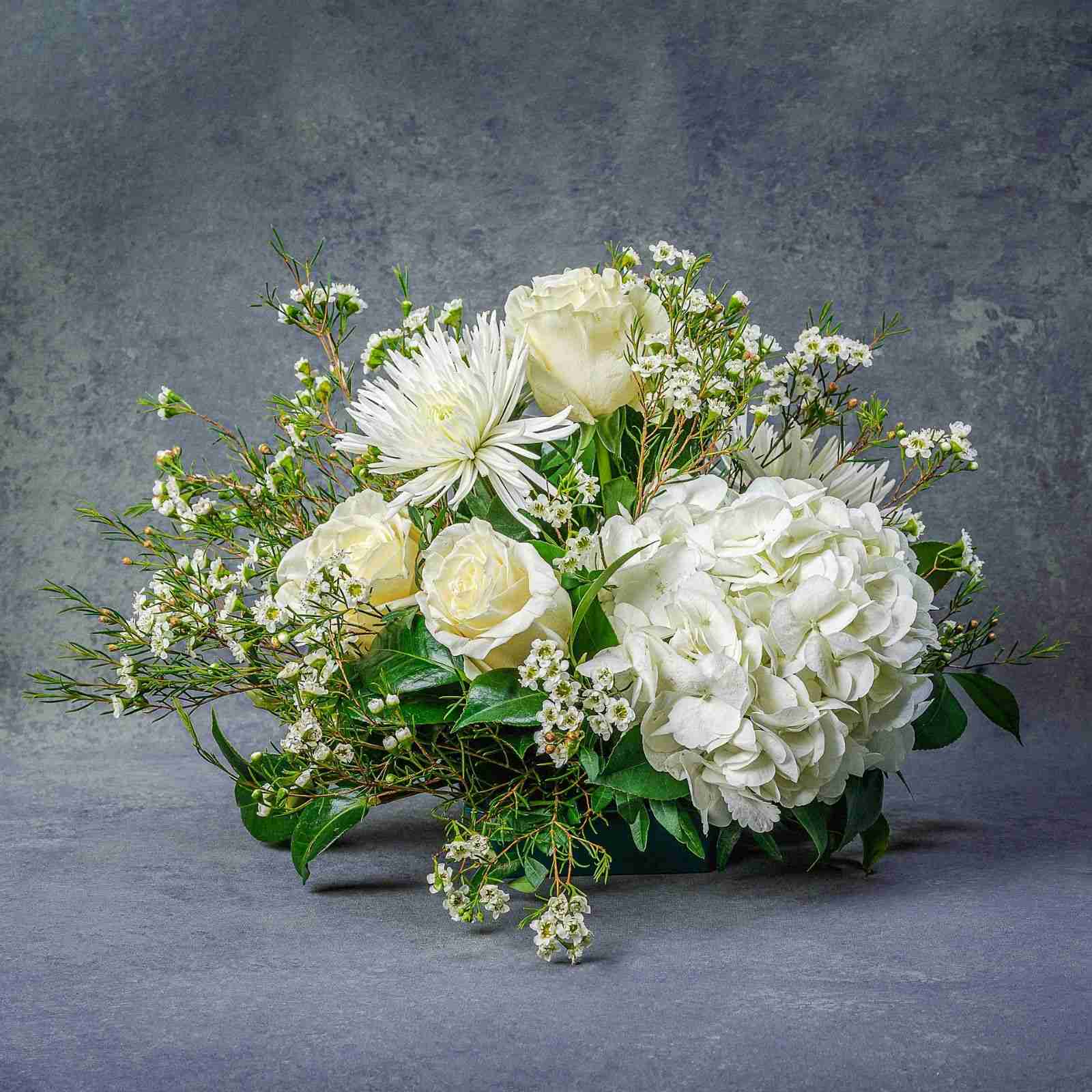 Arreglo de flores blancas para el cementerio.