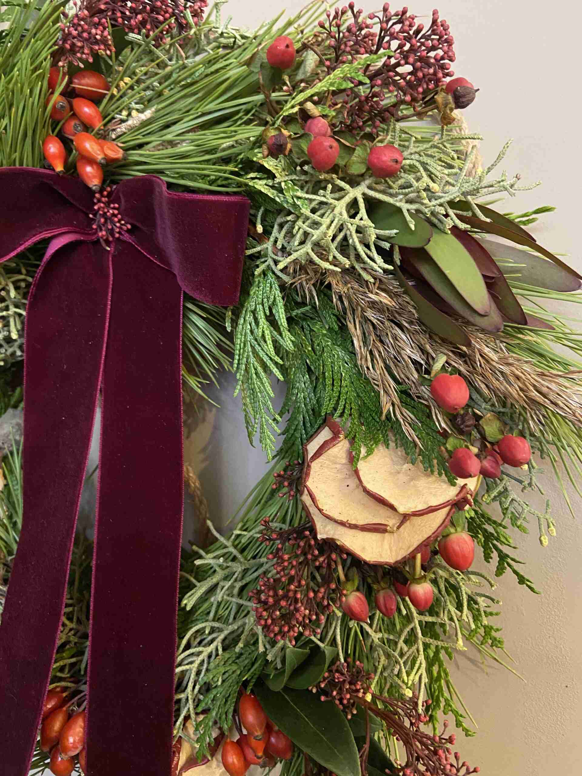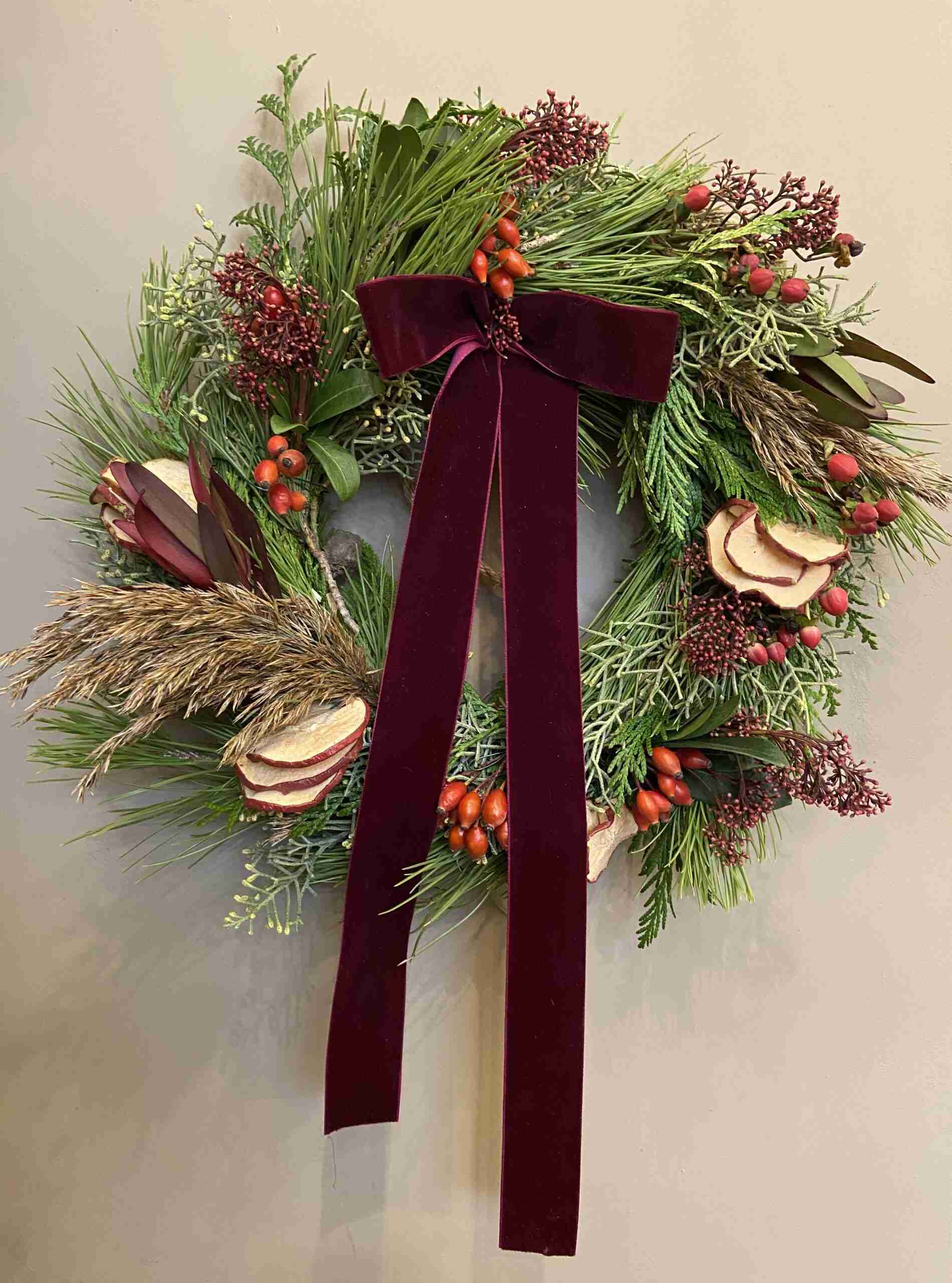 corona de navidad de flores y verdes frescas: En Floristería La Jara, realizamos coronas de navidad de 35 cm aprox. de diámetro.Usamos acebo, pino, skimia, leucadendro, arizonica, pinsapo, manzada o naranja deshidratada, escaramujo etc.., Adornada con lazo de terciopelo granate. Incluye un lazo de terciopelo granate de gran calidad. Este producto es ideal para regalar en ocasiones especiales como cumpleaños, aniversarios, Día de la Madre o San Valentín. Desde Floristería La Jara en Valladolid, te lo preparamos con mimo y te lo enviamos a domicilio. Perfecto para llenar de color y emoción cualquier momento. Compra online y sorprende con flores frescas y originales.