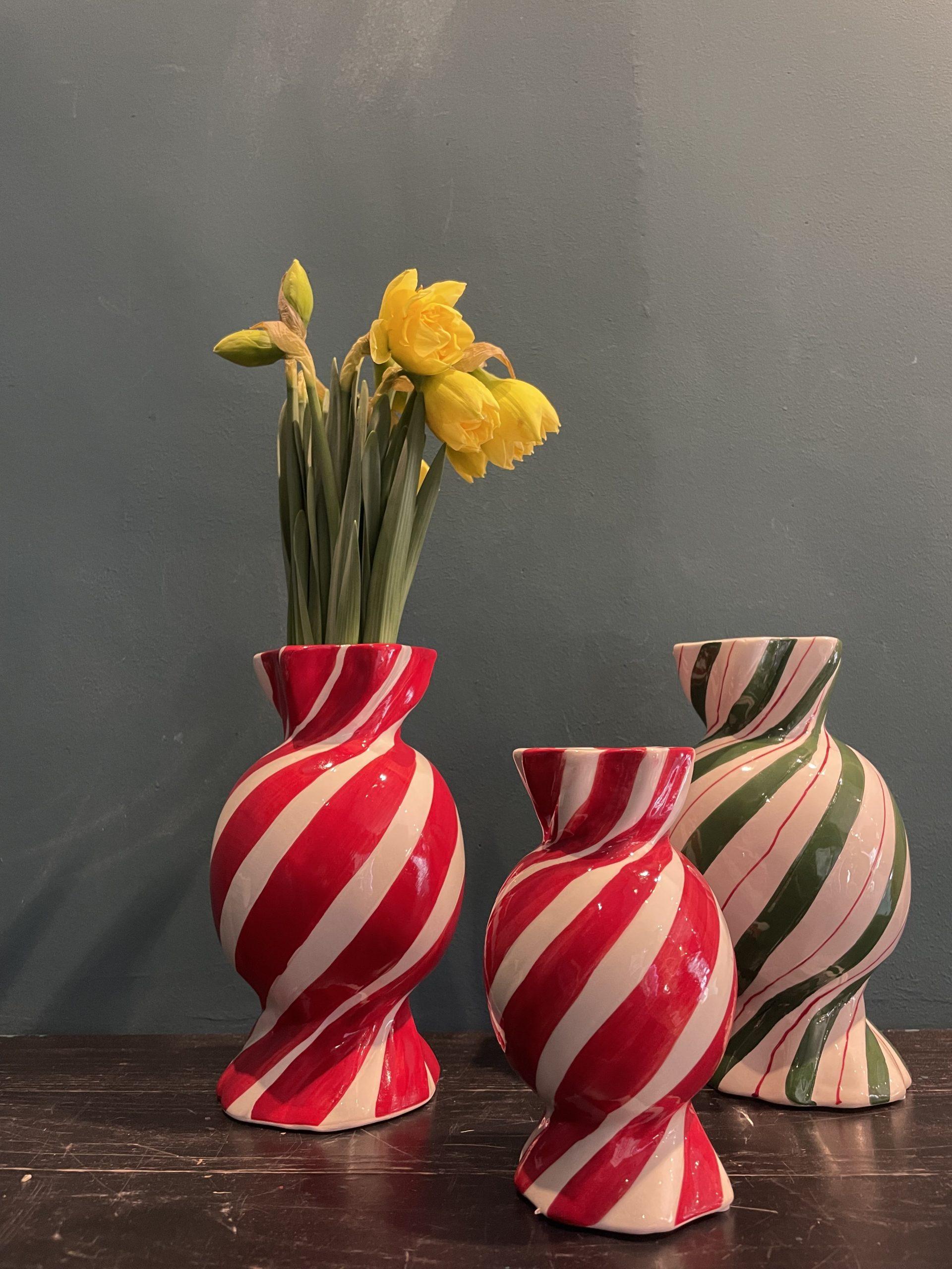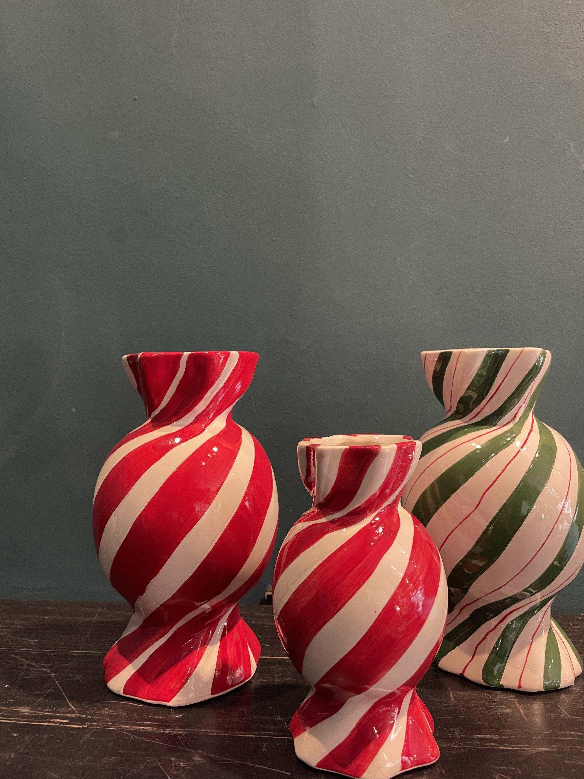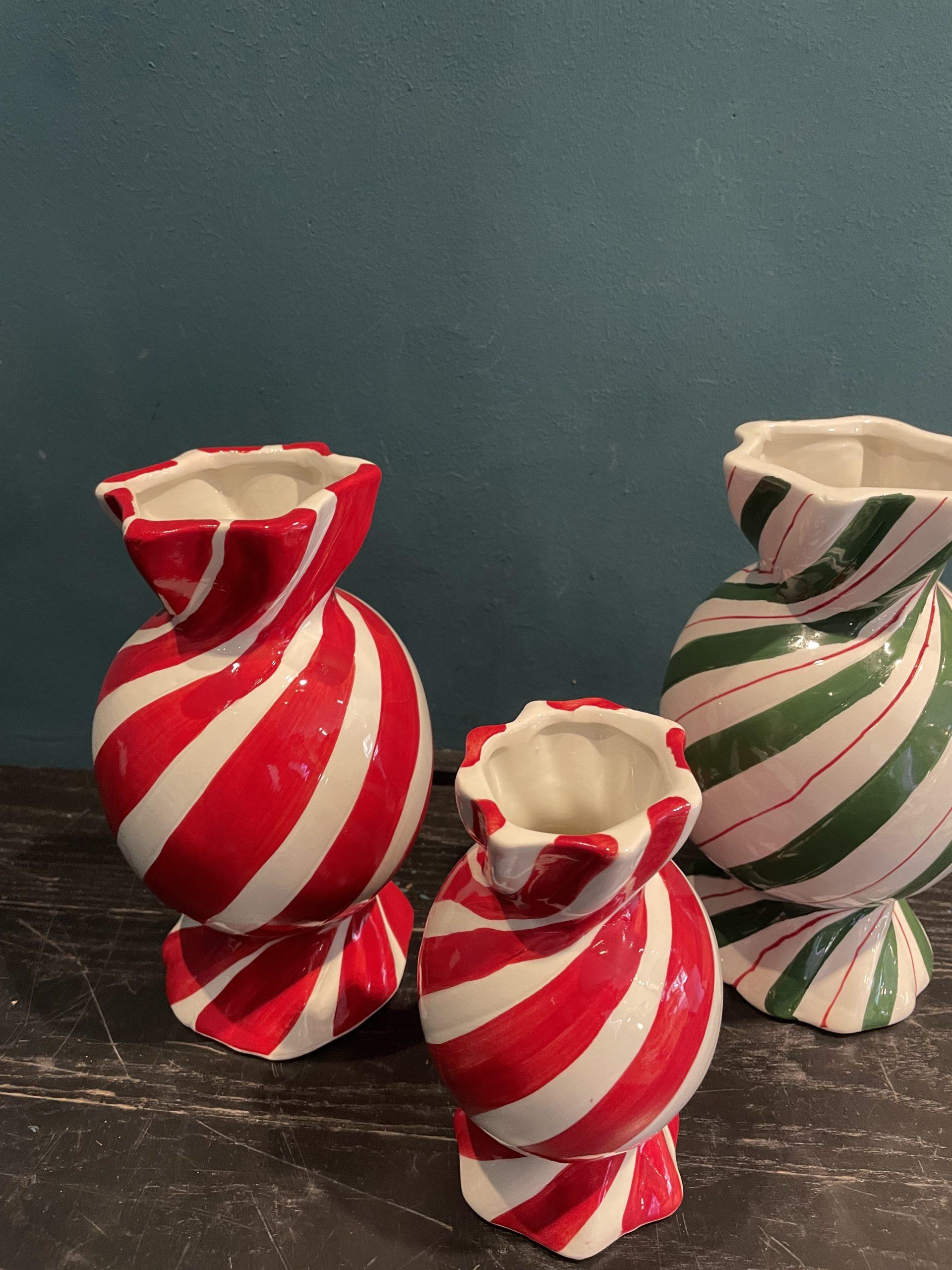 Jarrón con forma de caramelo. Cerámica pintada. Para poner con flores frescas en agua, es impermeable.
