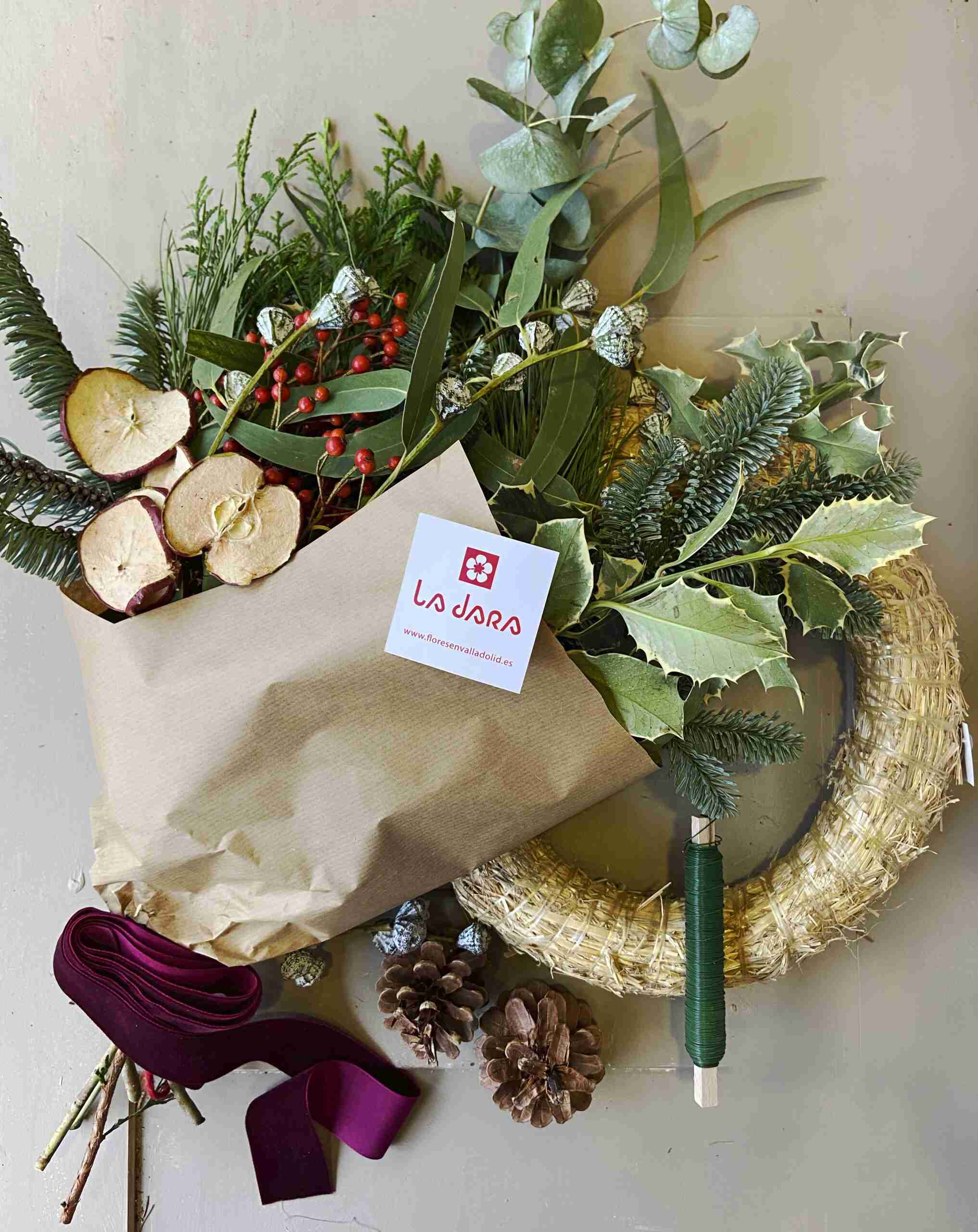 Kit de corona de navidad: Si prefieres ponerte manos a la obra con tu corona de navidad, te proporcionamos todo lo que necesitas para realizarla igual que la hacemos en la Jara, este kit incluye todo lo necesario. Incluye: alambre de florista, lazo de terciopelo, diferentes verdes como pino, pinsapo, arizonica, eucalipto y adornos como manzana o naranja deshidratada, escaramujo, piñas, etc.. Este producto es ideal para regalar en ocasiones especiales como cumpleaños, aniversarios, Día de la Madre o San Valentín. Desde Floristería La Jara en Valladolid, te lo preparamos con mimo y te lo enviamos a domicilio. Perfecto para llenar de color y emoción cualquier momento. Compra online y sorprende con flores frescas y originales.